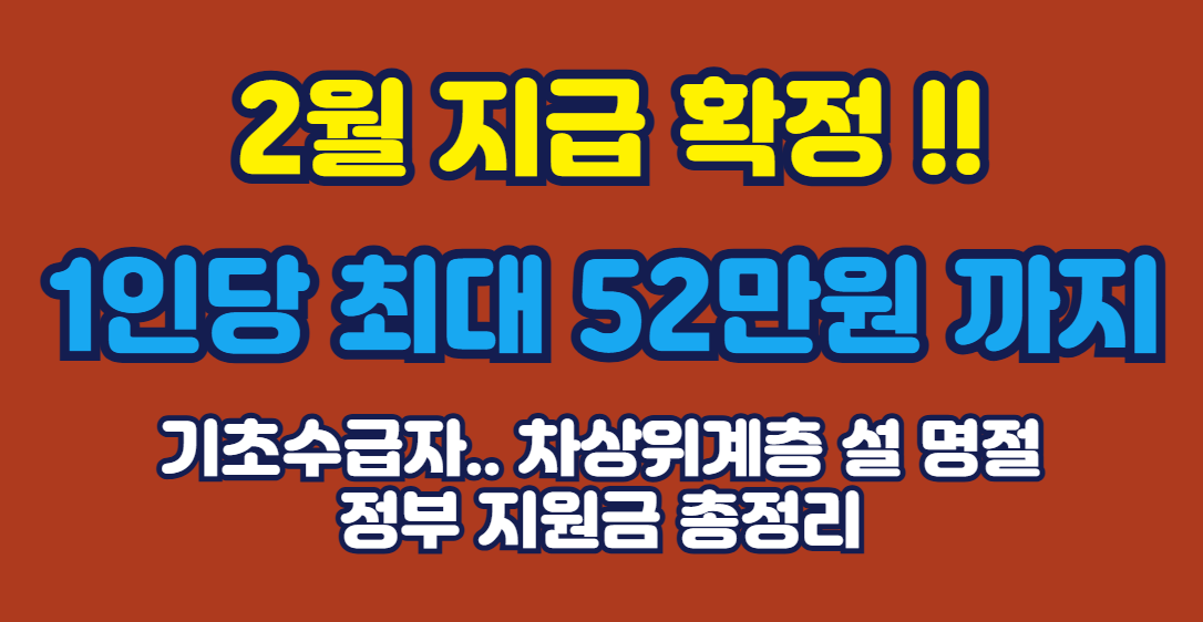 2026년 설 명절 정부 지원금이 2월 13일 조기 지급됩니다. 민생회복지원금, 기초생활급여, 특별생계비 등 소득별로 1인당 15~52만 원까지 지원. 신청 방법·자격·지급일 한눈에 정리.